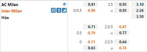 Mặc dù được tính là đội chủ nhà những AC Milan vẫn bị đánh giá thấp hơn đối thủ khi được chấp với tỷ lệ 1/4 trên sàn giao dịch châu Á ở thời điểm hiện tại. Ở cuộc đối đầu tương tự gần nhất Inter Milan cũng có tỷ lệ chấp 1/4 nhưng nửa xanh thành Milan đã không thể vượt kèo khi chỉ có được kết quả hoà 1-1. Nhưng quá khứ vẫn đang ủng họ Inter Milan khi họ bất bại khi làm khách của AC Milan kể từ tháng 2 năm 2016