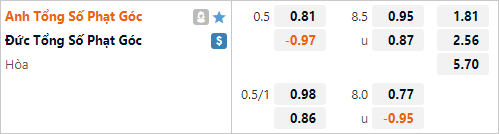 3/4 trận đấu gần nhất của ĐT Đức cũng có ít nhất 9 tình huống phạt góc, trong khi bên phía ĐT Anh cũng có 3/5 trận gần nhất có kết quả tương tự. Nhưng với dự đoán trận đấu này sẽ diễn ra sôi nổi thì nhiều khả năng trận đấu sẽ có một kết quả khác biệt.