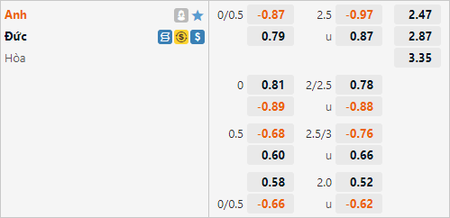 Tỷ lệ tài xỉu của trận đấu đang được duy trì ở mức 2 1/2 và điểm ăn ít bên phía cửa xỉu. Điểm đáng chú ý là 4 cuộc đối đầu gần nhất của hai đội tuyển đã kết thúc với kết quả xỉu, 4/5 trận gần của ĐT Anh cũng có kết quả tương tự. Trong khi đó bên phía ĐT Đức cũng có tới 6/7 trận đấu diễn ra trong năm nay kết thúc với nhiều nhất là 2 bàn thắng.
