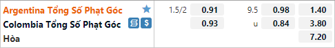 Tỷ lệ tài xỉu phạt góc của trận đấu đang được công khai ở mức 9 1/2, đây là mức tỷ lệ hợp lý nếu nhìn vào những trận đấu vừa qua của hai đội, 3 trong 4 trận đấu gần nhất của Argentina kết thúc với ít nhất 11 tình huống phạt góc. Trận đối đầu gần nhất của Colombia và Argentina cũng kết thúc với 12 quả phạt góc.