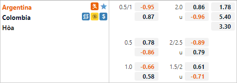 Hiện tại trên sàn giao dịch châu Á nhà cái đang công khai mức chấp 3/4 của Argentina, đây là mức tỷ lệ chấp hợp lý ở thời điểm này khi Colombia không có được phong độ tốt. Tỷ lệ tài xỉu của trận đấu đang ở mức 2 hoà điểm ăn ít bên phía của tài, đây là mức tỷ lệ tương đối thấp nếu nhìn vào trận đối đầu gần nhất của hai đội tuyển diễn ra cách đây 1 tháng. Ở trận đấu đó Colombia đã có kết quả hoà 2-2 khi tiếp đón Argentina trên sân nhà.