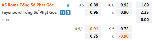 Tỷ lệ tài xỉu phạt góc của trận đấu được duy trì ở mức 10 hoà. Theo thống kê thì 5/6 trận đấu gần nhất AS Roma kết thúc với nhiều hơn 10 tình huống phạt góc được ghi nhận, trong khi Feyenoord có kết quả hoàn toàn ngược lại khi chỉ có 1/5 trận gần nhất có kết quả tài phạt góc.