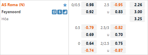 Trên sàn giao dịch châu Á hiện tại AS Roma có tỷ lệ chấp 1/4 và mức điểm ăn tương đối cân bằng. Đây là mức chấp tương đối thấp của đội bóng Italia bởi thực tế họ có chất lượng đội hình tốt hơn Feyenoord. Tỷ lệ tài xỉu của trận đấu được công khai ở mức 2 1/2 và điểm ăn ít bên phía cửa xỉu, mức tài xỉu này là hợp lý so với một trận chung kết.