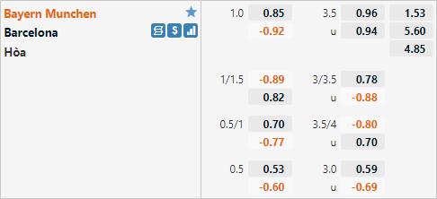 Trên sàn giao dịch châu Á Bayern Munich đang được nhà cái đánh giá cao hơn với tỷ lệ chấp 1 hoà trận này. Có thể thấy mặc dù không còn động lực thi đấu nhưng Hùm Xám vẫn đang được nhà cái đánh giá cao khi ở lần tiếp đón Barcelona gần nhất họ chỉ được đánh gia tương đồng với đối thủ.