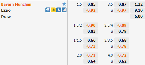 Trên sàn giao dịch châu Á ở thời điểm hiện tại Bayern Munich đang có tỷ lệ chấp 1 1/2 và mức điểm ăn ít, tỷ lệ tài xỉu của trận đấu được duy trì ở mức 3 1/2 và mức điểm ăn tương đối cân bằng. Đây là mức tài xỉu tương đối cao, nhưng tương đối hợp lý khi Lazio đã không còn gì để mất trận đấu này.
