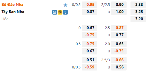 Hiện tại trên sàn giao dịch châu Á Bồ Đào Nha được xếp ở vị trí cửa trên với tỷ lệ chấp 1/4. Mức chấp này là tương đối cao khi trận đấu lượt đi Tây Ban Nha đã có tỷ lệ chấp 1/2 khi có lợi thế sân nhà. Điểm đáng chú ý là trong 6 cuộc đối đầu gần nhất các đội thắng kèo châu Á đều là đội được xếp ở cửa dưới.