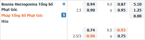 Tỷ lệ tài xỉu phạt góc của trận đấu đang được nhà cái châu Á công khai ở mức 9 hoà. Đây là mức tỷ tương đối thấp so với mặt bằng chung của giải đấu. Ở lần đối đầu gần nhất của hai ĐT đã có tới 13 tình huống phạt góc được ghi nhận, 3 trận đấu gần nhất của Bosnia cũng không trận đấu có ít hơn 9 tình huống phạt góc. 2 trận đấu đầu tiên của ĐT Pháp ở vòng loại WC 2022 lần này cũng không có ít hơn 9 tình huống phạt góc. Với hoàn cảnh của trận đấu này, nhiều khả năng ĐT Pháp sẽ hoàn toàn làm chủ trận đấu với nhiều thời gian kiểm soát bóng, với khả năng tấn công đa dạng của ĐT khách thì việc họ có nhiều tình huống phạt góc là điều hoàn toàn dễ hiểu