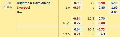 Chuyên gia AEGoal phân tích, dự đoán kèo tài xỉu, phạt góc trận Brighton vs Liverpool diễn ra lúc 19h30 ngày 28/11 trong khuôn khổ giải Ngoại hạng Anh.