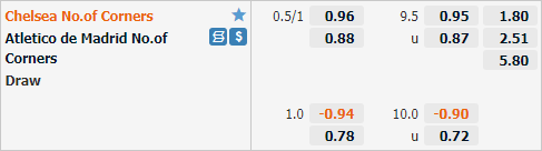 Trên sàn giao dịch châu Á hiện tại Chelsea với lợi thế được thi đấu trên sân nhà đang có tỷ lệ chấp 1/4. Tỷ lệ tài xỉu của trận đấu được công khai ở mức 2 hoà, đây là mức tỷ lệ tương đối thấp so với mặt bằng chung của giải đấu nhưng là hợp lý khi Atletico Madrid không tân công hiệu quả thời điểm này còn Chelsea đang có lợi thế dẫn trước.