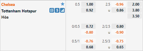 Với lợi thế sân nhà Chelsea đang được nhà cái châu Á đánh giá ở cửa trên với tỷ lệ chấp 1/2 cho trận đấu này. Đây có thể coi là mức tỷ lệ chấp tương đối thấp của đội chủ nhà khi ở cuộc đối đầu gần nhất mặc dù phải thi đấu trên sân khách Chelsea cũng đã có tỷ lệ chấp 1/2. Nhưng mức tỷ lệ này không quá vô lý khi Chelsea không có được lực lượng tốt nhất cho trận đấu này.