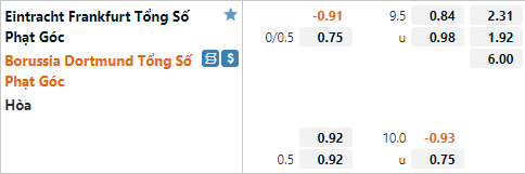 Tỷ lệ tài xỉu phạt góc của trận đấu đang được nhà cái châu Á công khai ở mức 9 1/2. Đây là mức tài xỉu tương đồng so với mặt bằng chung của giải đấu, nhưng là tương đối thấp so với quá khứ đối đầu của hai đội. Cụ thể là có tới 5/6 cuộc chạm trán gần nhất đều ghi nhận có ít nhất 10 tình huống phạt góc. 3 trận đấu gần nhất của Frankfurt cũng có kết quả tương tự trong khi còn số này bên phía Dortmund 6/7 trận gần nhất. Có thể thấy lối chơi của cả 2 đội đều đang tạo ra rất nhiều tình huống phạt góc, nhiều khả năng trận đấu này cũng không phải là ngoại lệ.