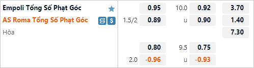Tỷ lệ tài xỉu phạt góc của trận đấu đang được duy trì ở mức 10 hoà. Đây là mức tài xỉu tương đối cao so với mặt bằng chung của giải đấu nhưng không có gì bất thường. Theo thống kê gần đây thì có tới 5/6 trận gần nhất của Empoli kết thúc với ít nhất 10 tình huống phạt góc được ghi nhận, còn số bên phía AS Roma là 3/5 trận gần nhất và 2 trận đầu còn lại cũng có tới 9 tình huống phạt góc.