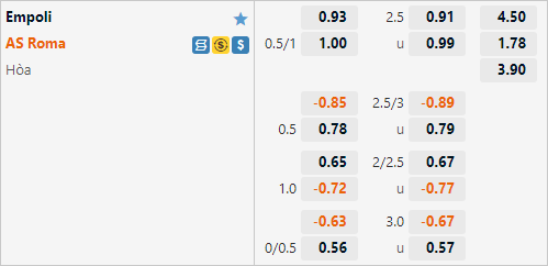 Hiện tại AS Roma được nhà cái châu Á đánh giá ở cửa trên với tỷ lệ chấp 3/4 và mức điểm ăn tương đối cân bằng. Mức chấp này nhỉnh hơn so với lần đối đầu tương tự gần nhất, ở trận đấu của mùa giải trước AS Roma chỉ có tỷ lệ chấp 1/2 và đội khách đã xuất sắc giành chiến thắng với tỷ số 4-2.
