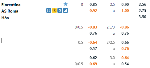 Hiện tại trên sàn giao dịch châu Á Fiorentina được đánh giá nhỉnh hơn đối thủ đôi chút với tỷ lê 0:0 và mức điểm ăn ít. Nhưng đây là vẫn là lần nhá cái đánh giá đội chủ nhà cao nhất so với 2 lần tiếp đón AS Roma gần nhất. Ở trận đấu tương tự gần nhất đội bóng thủ đô đã có tỷ lệ chấp 1/2 và giành chiến thắng 2-1.