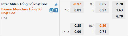 Tỷ lệ tài xỉu phạt góc của trận đấu đang được duy trì ở mức 9 1/2 cả trận. Đây là mức tài xỉu tương đồng với mặt bằng chung của giải đấu hôm nay và không có điều gì bất thường. 3/5 trận gần nhất của Inter Milan ghi nhận nhiều hơn 9 tình huống phạt góc, trong khi con số này bên phía Bayern Munich 7/8 trận. Có thể thấy lối chơi của cả hai đều đem lại tương đối nhiều tình huống phạt góc. Rất có thể trận đấu này cũng không phải là ngoại lệ.