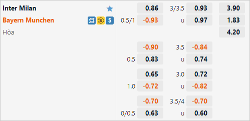 Hiện tại đội khách Bayern Munich đang được nhà cái châu Á đánh giá ở cửa trên với tỷ lệ chấp 3/4 và mức điểm ăn bỏ trên sàn giao dịch. Mức chấp của đại diện Đức trận này là hợp lý so các trận đối đầu gần đây. Điểm đáng chú ý là Bayern Munich thắng cả 2 lần làm khách của Inter Milan gần nhất.