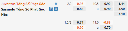 Tỷ lệ tài xỉu phạt góc của trận đấu đang là 10 1/2 và mức điểm ăn cân bằng. Theo thống kê đấu đối đầu thì có tới 4/6 cuộc đối đầu gần nhất của hai đội ghi nhận nhiều hơn 10 tình huống phạt góc. Nhưng ở thời điểm hiện tại lối chơi của Juventus không đem lại cho họ nhiều tình huống phạt góc. Cụ thể là trong 5 trận đấu gần nhất Juventus chi có tổng cộng 13 tình huống phạt góc, đồng nghĩa với mức trung bình chưa tới 3 quá phạt góc 1 trận.