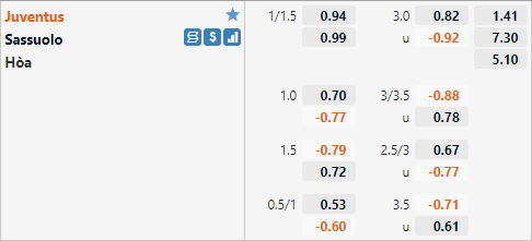 Ở phía bên kia Sassuolo thi đấu không tốt kể từ đầu mùa, họ thường không đạt được kỳ vọng của nhà cái châu Á đặt ra trước những trận đấu (thua kèo 7/9 trận mùa này tại Serie A). Mặc dù vậy các trận đấu của Sassuolo vẫn diễn ra rất sôi nổi bởi lối chơi tương đối cởi mở. Nhưng trận đấu này sẽ khó diễn ra một kịch bản cởi mở khi họ phải làm khách của Juventus đang thi đấu thực dụng. Lựa chọn cửa xỉu có lẽ vẫn làm một lựa chọn tốt cho trận đấu này.