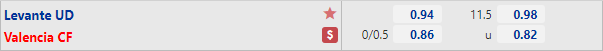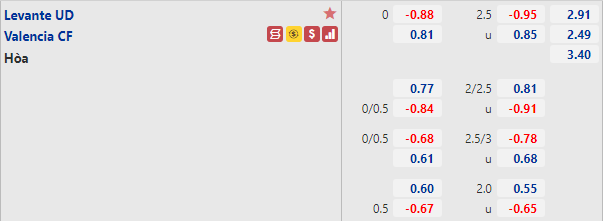 Mặc dù có thứ hạng cao hơn đối thủ rất nhiều nhưng Valencia chi được đánh giá nhỉnh hơn đối thủ đôi chút với tỷ lệ 0:0 và mức điểm ăn ít trên sàn giao dịch châu Á. Nhưng với mức tỷ lệ này nhà cái châu Á đã đánh giá cao Valencia khi ở trận đấu tương tự của mùa giải trước Valencia còn được chấp với tỷ lệ 1/4.