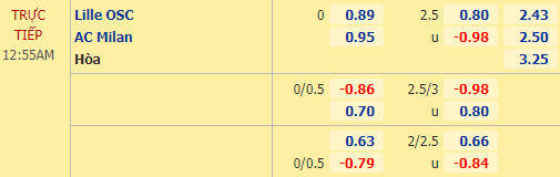 Dù rằng 3 trận gần đây của Lille cùng 9 trận vừa qua của AC Milan đều xuất hiện tối thiểu 3 lần lưới rung nhưng với mức tài xỉu 2 1/2 nhà cái đưa ra cho trận này thì khả năng cởi mở lại không được đánh giá cao. Đôi bên đều chưa chắc chắn có vé đi tiếp nên cần thận trọng hơn ở cuộc chiến này, đặc biệt là AC Milan sau thất bại bẽ bàng ở lượt đi.