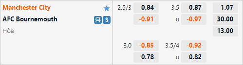 Hiện tại Man City đang được nhà cái đánh giá rất cao với tỷ lệ chấp 2 3/4 cho trận đấu này. Đây là mức chấp cao của Man City nếu nhìn vào lịch sử đối đầu của hai đội. Ở trận đấu tương tự gần nhất tại giải Ngoại hạng Anh thì Man City cũng chỉ có tỷ lệ chấp 2 1/4. Điểm đáng chú ý là 3 lần tiếp đón Bournemouth gần nhất mặc dù vẫn giành chiến thắng nhưng các cầu thủ Man City đã không thể vượt qua kỳ vọng nhà cái đặt ra cho họ.