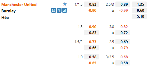 Với lợi thế sân nhà và lực lượng vượt trội so với đối thủ Quỷ đỏ được nhà cái châu Á công khai mức chấp chính 1 1/2 trên sàn giao dịch. Đây có thể coi là mức chấp cao khi 2 trận đấu tương tự của hai mùa giải trước Man Utd đều chỉ có tỷ lệ chấp 1 1/4. Mặc dù luôn được đánh giá cao hơn đối thủ nhưng Man Utd thường có kết quả không tốt khi tiếp đón Burnley, đội chủ sân Old Trafford chỉ thắng được 1/5 lần đối đầu gần nhất với Burnley trên sân nhà.