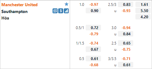 Với lợi thế sân nhà Man Utd đang có tỷ lệ chấp 1 hoà và mức điểm ăn bỏ trên sàn giao dịch châu Á. Đây là mức tỷ lệ chấp thấp nếu so với trận đấu tương tự của mùa giải trước, ở trận đấu đó Man Utd đã có tỷ lệ chấp 1 1/4 và đội chủ nhà đã kết thúc trận đấu với chiến thắng rất đậm 9-0 khi Southampton phải thi đấu thiếu người từ phút thứ 2 do thẻ đỏ.