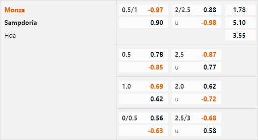 Hiện tại Monza đang được nhà cái châu Á đánh giá ở cửa trên với tỷ lệ chấp 3/4 trận này. Có thể thấy đây là mức chấp tương đối cao của đội chủ nhà khi ở trận đấu lượt đi diễn ra hồi tháng 10 năm 2022 Sampdoria còn được đánh giá ở vị trí cửa trên với tỷ lệ chấp 1/4, trận đấu đó Sampdoria đã gây thất vọng khi thất bại với tỷ số 0-3. Nhưng mức chấp trận này phù hợp với vị trí và phong độ hiện tại của hai đội.