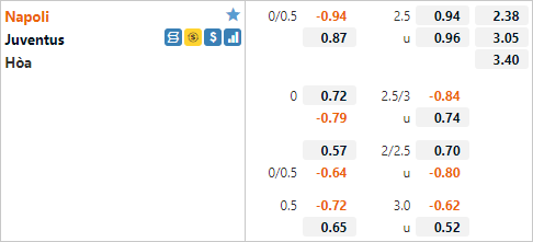 Trên sàn giao dịch châu Á lúc này Napoli với lợi thế sân nhà đang được nhà cái xếp ở vị trí cửa trên với tỷ lệ chấp 1/4. Đây cũng là lần đầu tiên kể từ tháng 3 năm 2019 Napoli được đánh giá ở cửa trên khi đối đầu với Juventus. Tỷ lệ tài xỉu của trận đấu đang duy trì ở mức 2 1/2.