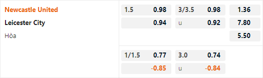 Hiện tại đội chủ nhà đang được đánh giá ở vị trí cửa trên với tỷ lệ chấp 1 1/2 và mức điểm ăn tương đối cân bằng ở 2 cửa. Có thể thấy đây là mức chấp rất cao của đội chủ nhà khi ở cuộc đối đầu tương tự gần nhất Newcastle chỉ có tỷ lệ chấp 1 hoà. Với mức chấp trận này có thể thấy giới chuyên môn đang đánh giá rất thấp Leicester bởi các cầu thủ Newcastle đã không còn nhiều động lực thi đấu.