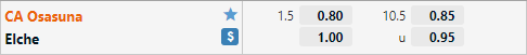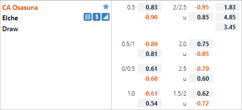 Với lợi thế sân nhà Osasuna đang được nhà cái châu Á đánh giá cao hơn với tỷ lệ chấp 1/2 và mức điểm ăn ít trận này. Ở trận đấu tương tự gần nhất Osasuna cũng có tỷ lệ chấp 1/2 và đã tận dụng tốt lợi thế sân nhà khi kết thúc trận đấu với chiến thắng 2-0.