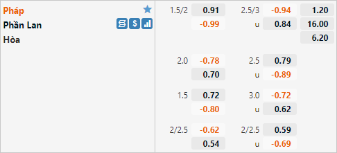 Hiện tại với lợi thế sân nhà ĐT Pháp đang có tỷ lệ chấp 1 3/4 trên sàn giao dịch châu Á. Đây là mức tỷ lệ tương đối thấp khi ở lần tiếp đón Phần Lan gần nhất trong một trận giao hữu diễn ra năm 2020 ĐT Pháp đã có tỷ lệ chấp tới 2 1/4, nhưng mức tỷ lệ này không quá vô lý khi ĐT Pháp không có được phong độ tốt và mất một số trụ cột trong trận đấu này.