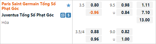 Tỷ lệ tài xỉu phạt góc của trận đấu đang được duy trì ở mức 9 hoà. Với dự đoán PSG sẽ không có trận đấu dễ dàng lần này thì lựa chọn cửa tài sẽ là phương án hợp lý. Bởi đội chủ nhà có thể sẽ phải lựa chọn phương án dứt điểm từ xa hay treo bóng bổng khi gặp khó khăn trong việc xuyên thủng hàng thủ của Juventus, điều này cũng đồng nghĩa với khả năng PSG sẽ có nhiều tình huống phạt góc.