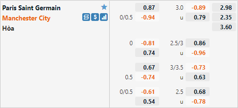 Mặc dù phải thi đấu trên sân khách nhưng Man City vẫn được nhà cái châu Á xếp ở cửa trên trận này với tỷ lệ chấp 1/4. Ở cuộc đối đầu tương tự của mùa giải trước đội bóng Anh cũng có tỷ lệ chấp 1/4 và họ đã ra về với chiến thắng 2-1.