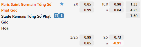 Tỷ lệ tài xỉu của trận đấu đang được niêm yết ở mức 10 hoà. Theo thông kê đối đầu có thể thấy nhưng cuộc chạm trán gần gần đây của hai đội không ghi nhận nhiều tình huống phạt góc, cụ thể là có tới 4/6 cuộc đối đầu gần nhất đều kết thúc với nhiều nhất là 10 tình huống phạt góc. Nhưng ở giai đoạn hiện tại lối chơi của PSG giúp họ có khá nhiều phạt góc, họ đã tạo ra được 34 tình huống phạt góc ở 4 trận đấu gần nhất đây là con số không hề thấp. Rất có thể trận đấu này cũng sẽ có nhiều tình huống phạt góc khi PSG được dự đoán sẽ làm chủ trận đấu trong phần lớn thời gian thi đấu.
