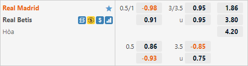 Real Madrid được nhà cái đánh giá cao hơn với tỷ lệ chấp 3/4 trên sàn giao dịch châu Á. Đây là mức chấp tương đối thấp của đội chủ nhà khi ở lần tiếp đón Betis gần nhất Kền Kền trắng đã có tỷ lệ chấp 1 hoà. Nhưng mức chấp này hoàn toàn hợp lý ở thời điểm hiện tại khi trận đấu không còn mang nhiều ý nghĩa với 2 đội.