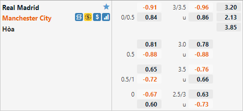 Ở trận đấu này Man City tiếp tục được nhà cái châu Á đánh giá ở cửa trên với tỷ lệ chấp 1/4 và mức điểm ăn ít. Có thể thấy đây là mức chấp tương đối thấp của đội khách nếu so với mức chấp 1 1/4 ở trận đấu lượt đi. Chuyến làm khách gần nhất đến sân Santiago Bernabeu Man City cũng đã có tỷ lệ chấp 1/4 và họ đã không làm thất vọng giới đầu tư khi giành chiến thắng với tỷ số 2-1.