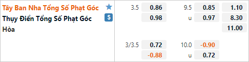 Nhưng ở thời điểm hiện tại lối chơi của ĐT Tây Ban Nha không tạo ra nhiều tình huống phạt góc, cụ thể trong 5 trận đấu gần nhất của đội chủ nhà chỉ có duy nhất 1 trận đấu kết thúc với nhiều hơn 9 tình huống phạt góc. Trong khi con số này bên phía ĐT Thuỵ Điển là 1 trong 8 trận đấu gần nhất có kết quả tài phạt góc