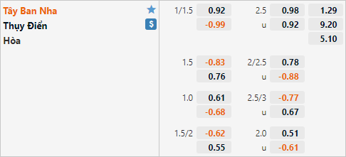 Hiện tại trên sàn giao dịch châu Á ĐT Tây Ban Nha đang có tỷ lệ chấp 1 1/4 trong khi mức tài xỉu của trận đấu được công khai ở mức 2 1/2. Đây có thể nói là mức tài xỉu tương đối thấp khi 3 trong 4 cuộc đối đầu gần nhất của hai đội đều kết thúc với 3 bàn thắng một trận.