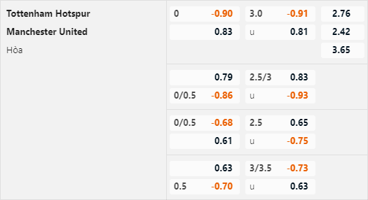 Trong khi đó Man Utd vẫn đang có được sự ổn định tương đối tại giải Ngoại hạng Anh, đội khách thắng kèo cả 3 vòng đấu gần nhất, nhưng 5 trận đấu gần nhất của họ tại giải Ngoại hạng Anh lại có kết quả xỉu. Giai đoạn này hàng thủ của Man Utd cũng thi đấu rất ổn định khi giữ sạch lưới ở 3 vòng đấu gần nhất, nhưng 2 đối thủ gần nhất của Man Utd là những đội đang không có phong độ tốt. Man Utd sẽ không dễ để lập lại thành tích khi đối đầu với Tottenham trận này.