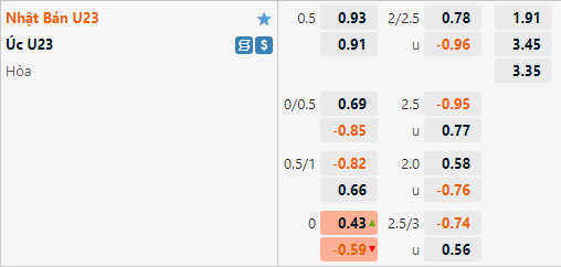 Hiện tại trên thị trường châu Á có U23 Nhật Bản có tỷ lệ chấp 1/2 và mức điểm ăn tương đối cân bằng. Đây là mức tỷ lệ chấp tương đối hợp lý nếu so sánh về tương quan lực lượng của hai đội ở giải đấu này. Trong khi đó tỷ lệ tài xỉu của trận đấu đang được duy trì ở mức 2 1/4 và điểm ăn ít bên phía cửa tài. Có thể thấy đây là mức tài xỉu tương đối thấp so với một trận đấu tranh hạng 3.