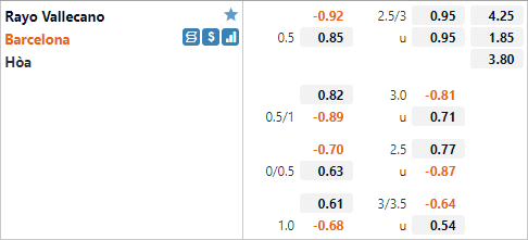 Trên sàn giao dịch châu Á hiện tại Barca đang có tỷ lệ chấp 1/2 và mức điểm ăn ít. Đây là mức tỷ lệ chấp rất thấp của Barcelona nếu so với quá khứ đối đầu của hai đội, ở lần làm khách của Vallecano gần nhất Barcelona đã có tỷ lệ chấp 1 1/2. Mức chấp rất thấp của đội khách trận này cho thấy giới chuyên môn đang nghi ngờ khả năng chiến thắng của Barcelona trận này.
