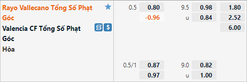 Mốc tài xỉu phạt góc của trận đấu đang được nhà cái công khai ở mức 9 1/2. Đây là mức tài xỉu phạt góc tương đối thấp nếu nhìn vào quá khứ đối đầu của hai đội, cụ thể là có tới 4 cuộc chạm trán gần nhất kết thúc với ít nhất 11 tình huống phạt góc được ghi nhận. 6 trận đấu gần nhất của Vallecano cũng ghi nhận ít nhất 9 tình huống phạt góc 1 trận. Với dự đoán cả hai đội sẽ gặp khó khăn trong việc ghi bàn thì rất có thể trận đấu này cũng có kết quả phạt góc tương tự, bởi hai đội có thể sẽ phải lựa chọn đến phương án dứt điểm từ xa hay treo bóng tư hai cánh khi gặp khó khăn trong việc tiếp cận khung thành đối phương.