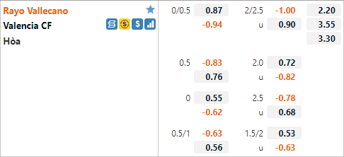 Trận đấu này Valencia bị nhà cái châu Á đánh giá ở của dưới với tỷ lệ chấp 1/4 của Vallecano, thậm chí đội khách còn có điểm ăn bỏ ở thời điểm hiện tại. Có thể thấy nhà cái đang đánh giá rất thấp khả năng chiến thắng của bầy dơi trận này. Ở trận đấu tương tự gần nhất các cầu thủ Valencia đã có tỷ lệ chấp 1/2 khi làm khách của Vallecano.