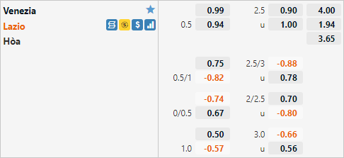 Mặc dù phải thi đấu trên sân khách nhưng Lazio vẫn được giới chuyên môn đánh giá cao hơn khi có tỷ lệ chấp 1/2 trên sàn giao dịch châu Á. Trong khi mức tài xỉu của trận đấu được duy trì ở mức 2 1/2, có thể thấy đây là mức tài xỉu tương đối thấp so với lối chơi cởi mở của Lazio.