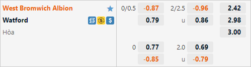 Trận đấu này West Brom được đánh giá nhỉnh hơn đối thủ đôi chút với tỷ lệ chấp 1/4 và mức điểm ăn bỏ trên sàn giao dịch châu Á khi có lợi thế sân nhà. Trận đấu tương tự gần nhất đã diễn ra năm 2017 và đội chủ nhà cũng có tỷ lệ chấp 1/4 ở thời điểm đó.