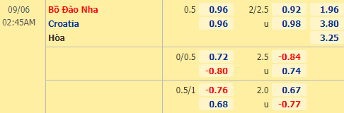 Kèo hiệp 1 Bồ Đào Nha chấp đồng banh có điểm bỏ khá sâu, và điều đó không hứa hẹn mang lại lợi thế dẫn bàn cho họ trước giờ nghỉ giải lao. Trước những đối thủ ngang tầm như Ukraine hay Italia và Hà Lan, Bồ Đào Nha đều không thể tạo ra ưu thế dẫn bàn trong hiệp 1. Thêm vào đó thì 2 lần chạm trán với Croatia mới nhất, Bồ Đào Nha cũng chỉ có kết quả hòa HT. Vì vậy, nên chọn Croatia ở hiệp 1 trận này.