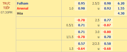 Kèo hiệp 1 Arsenal chấp 1/4 là chưa khả quan, khi mà kèo cả trận họ đã chấp tới 1 hòa. Lần gần nhất làm khách ở Craven Cottage, Arsenal thắng đậm nhưng là ở hiệp 2, còn hiệp 1 họ chỉ có kết quả hòa với Fulham. Nhìn chung thì với tỷ lệ HT như vậy, chọn cửa dưới là sáng giá hơn.