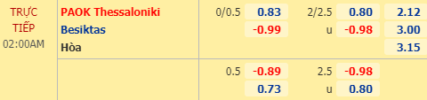 AEGoal soi kèo tổng bàn thắng và kèo hiệp 1 trận cầu giữa PAOK vs Besiktas trong khuôn khổ vòng loại Champions League diễn ra lúc 01h00 ngày 26/08.
