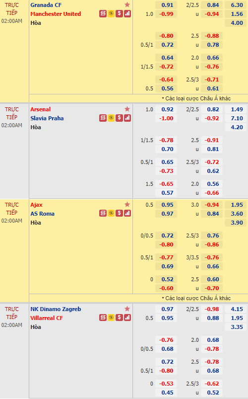 Trên sàn châu Á, kèo chấp nhà cái đưa ra dành cho cả MU lẫn Arsenal đều là 1 hòa. Đây là điều không hề bất ngờ, bởi 2 đại diện của Premier League được đánh giá là vượt trội so với đối phương về nhiều phương diện. Tuy nhiên, Arsenal được thi đấu ở sân nhà và tỷ lệ chấp như vậy chưa hẳn là cao. Đối thủ của họ - Slavia Praha từng thắng trên đất Anh trước Leicester trong bối cảnh cũng được chấp 1 hòa tương tự như trận này.